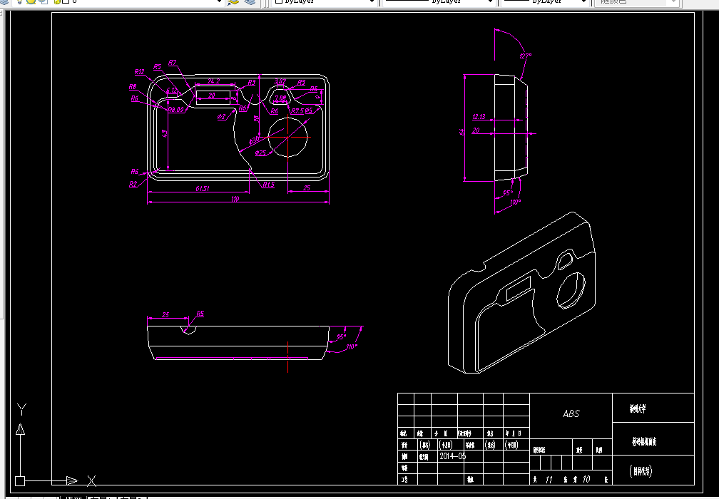 这次设计是对数码相机面壳的注射模进行了设计研究。该塑件成品的表面要求一般沙面,但要求耐老化耐磨损,使用寿命较长。故在设计中选ABS(丙烯腈-丁二烯-苯乙烯共聚物),潜浇口以保证其外观要求。由于塑件有较复杂外形轮廓及内部结构,产品倒钩距离较长需做油缸斜抽芯,对模具结构型腔排布的限制和生产数量等生产成本综合考虑,确定在该设计中,型芯型腔为便于加工尽量使用镶嵌件,以减少生产成本,保证塑件制品的加工成型精度。同时,本设计在模具结构细节和其他动作原理方面作了较为详细的解释说明。最后结合模具的结构和标准零件的选用完成了整套模具的装配,对有关技术规范进行了全面校核,确保所设计的模具结构合理并能安全可靠的用于批量生产。本设计阐述了结合使用 Pro/E,AutoCAD 完成装配图,零件图。