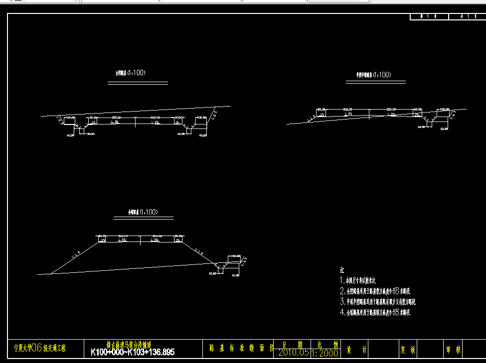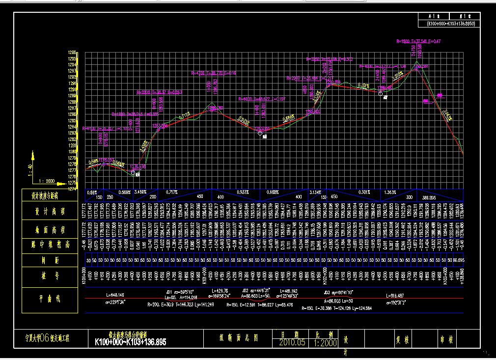本次毕业设计题目是银古高速公路辅道马莲台(C100-C101)段路线设计,采用三级公路双车道、设计车速为30km/h的标准进行设计。本次设计首先在平原微丘区选线、定线,然后按照国家有关的规范完成道路平面、纵断面、横断面的组合设计。本路线全长3.136Km,平曲线最小半径为150m,平曲线的长度占路线总长的21.1%。最大纵坡为3.643%,竖曲线的长度占路线总长21.86%。路线平面、纵断面、横断面的设计均满足规范要求。