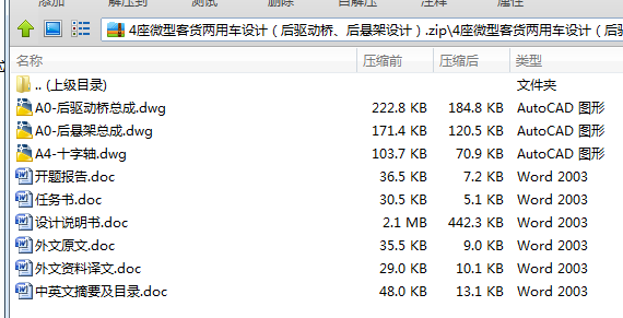 本设计为4座微型客货两用车的后驱动桥、后悬架设计。参照现有的生产技术水平,综合考虑生产成本,以及使用条件等多种因素, 经过收集各类型的后驱动桥、悬架的资料、实车观测和老师的指导,完成了本次设计。