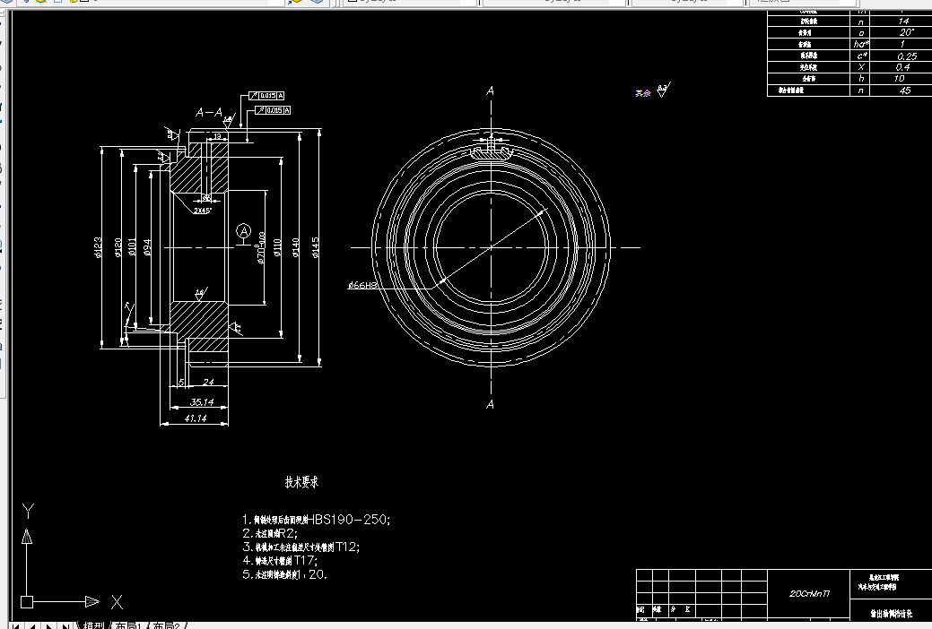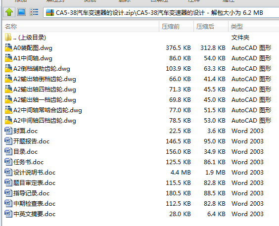本设计的CA5-38变速器,主要任务是完成齿轮、轴、箱体等的设计及校核,和位置的确定,并满足其承载能力的同步器。另外,针对齿轮作用力的不同,可以在不同的轴上选择合适的轴承。利用AUTCAD完成变速器的总成图、第一轴、第二轴、中间轴、各个挡齿轮及同步器的设计。