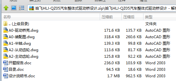 本次设计的题目是哈飞民意汽车驱动桥设计。驱动桥一般由主减速器、差速器、半轴及桥壳四部分组成,其基本功用是增大由传动轴或直接由变速器传来的转矩,将转矩分配给左、右车轮,并使左、右驱动车轮具有汽车行驶运动学所要求的差速功能;此外,还要承受作用于路面和车架或车厢之间的铅垂力、纵向力和横向力。