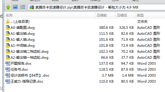 本次设计的题目是奥腾皮卡变速器设计。依据皮卡相关参数可设计出基本符合要求的中间轴式手动变速器。中间轴式变速器由于具有体积小、原理简单、工作可靠、操纵方便等优点,故在大多数汽车中广泛应用。本设计研究中间轴式五档手动变速器,其目的主要是基于对机械原理、机械设计、AutoCAD等知识的熟练运用和掌握,同时运用汽车构造、汽车设计、材料力学等学科知识,对中间轴式变速器的各部件进行设计,并利用AutoCAD软件绘制装配图和零件图。本文将概述变速器的现状和发展趋势;对其工作原理进行阐述,选择合理的传动方案进行设计;确定各档传动比及齿轮参数选择;对变速器的各档齿轮和轴以及轴承做了详细的设计计算与校核;对同步器和操纵机构及箱体进行选择。