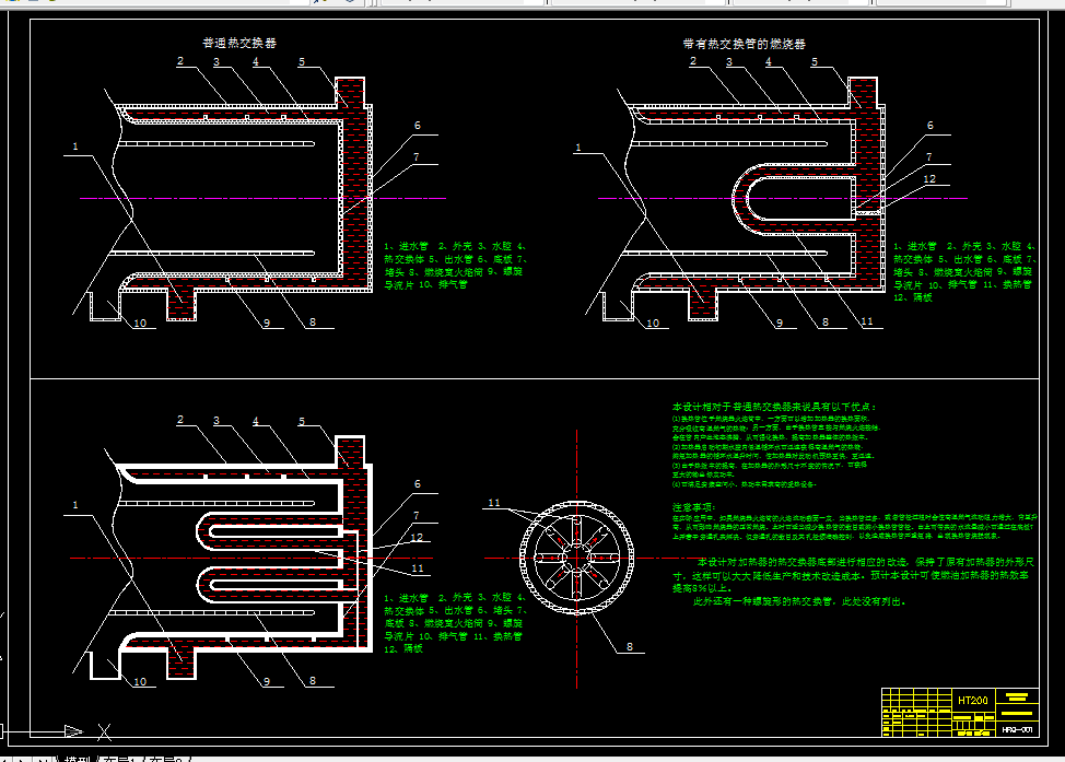 目前大多数液体型燃油加热器均采用螺旋式水腔进行换热,因该类换热器的换热面积受到制约,故热量损失较大。针对现有燃油加热器热交换器所存在的不足,充分的利用所学的知识,联系自己的想法设计了一种换热效率更高的带换热管的燃油加热器用热交换器。此热交换器的换热管位于燃烧器火焰筒中,一方面可以增加加热器的换热面积,充分吸收高温燃气的热能;另一方面,由于换热管直接与燃烧火焰接触,会在管内产生泡态沸腾,从而强化换热,提高加热器整体的热效率。此外,还设计了一系列新型的尾气换热器,充分利用加热器的尾气提前对换热水进行加热,明显提高了加热器的功率、效率,降低了排放。