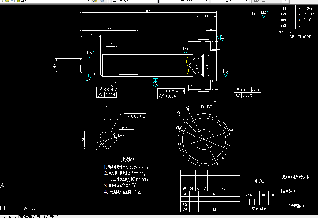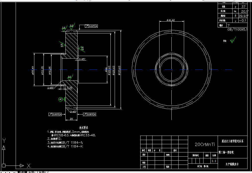 采用中间轴式变速器,该变速器具有两个突出的优点:一是其直接档的传动效率高,磨损及噪声也最小;二是在齿轮中心距较小的情况下仍然可以获得较大的一档传动比。这台变速器具有五个前进档(包括一个超速档五档)和一个倒档,并通过锁环式同步器来实现换档。本设计论述了变速器的总体结构,在设计中完成了各挡齿轮和轴的计算和校核及CAD绘图等工作。