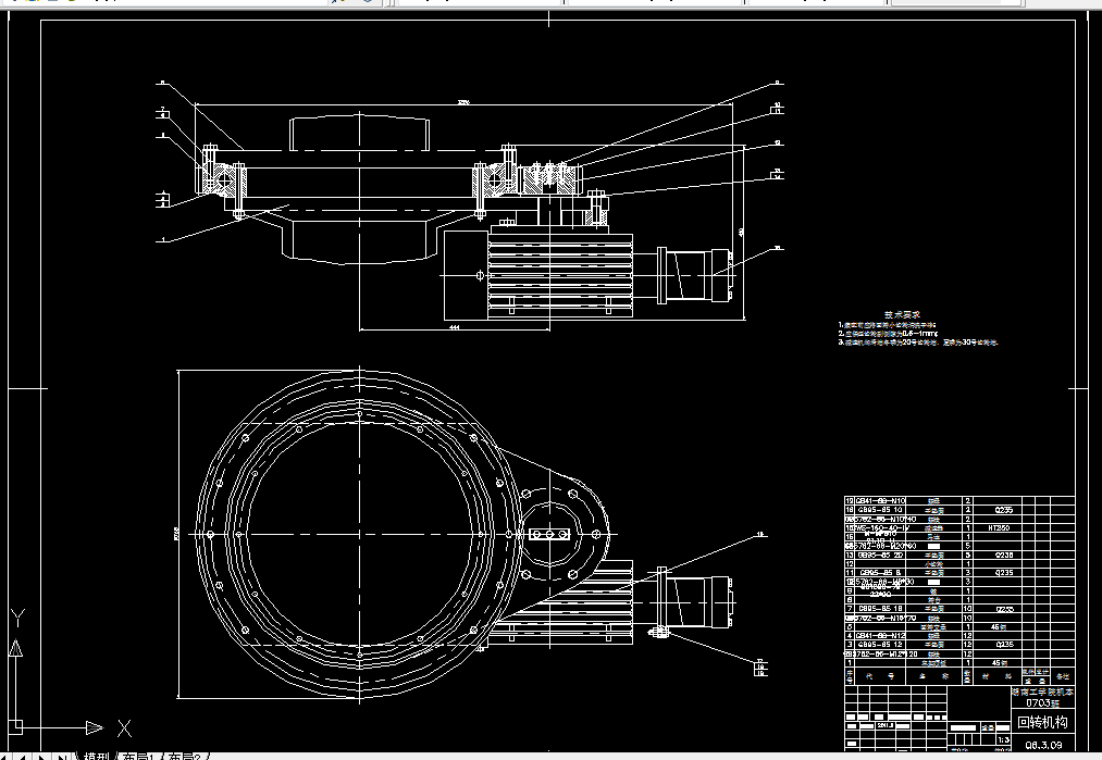 回转机构设计 回转机构由回转支承装置和回转驱动装置组成。即一对脂润滑的回转支承装置、蜗轮旋杆减速机和液压马达。这种结构自重轻、受力合理、运行平稳,可以使机构在水平面内运输货物。