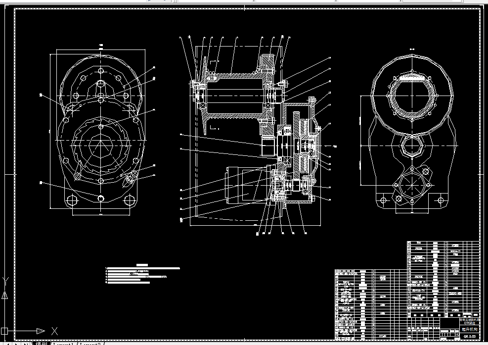 起升机构设计 起升机构包括液压马达、减速机、棘轮停止器和卷筒。减速机用来降低液压马达驱动速度,卷筒用于绕进或放出钢丝绳。机构工作时,液压马达驱动减速机,减速机的低速轴带动卷筒,将钢丝绳卷上或放出,经过滑轮组系统使载荷实现上升或下降,其升降由马达的旋转方向而定,通过棘轮停止器实现制动。