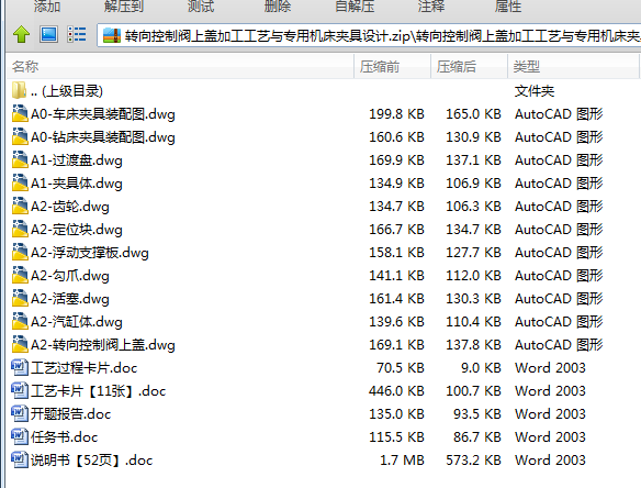 本次毕业设计题目为转向控制阀上盖加工工艺与专用机床夹具设计。设计中在分析转向控制阀上盖结构和工艺特点的基础上,确定毛坯的类型与尺寸,拟定加工工艺路线,应用计算法和查表法确定加工表面的加工余量,计算各工序的切削用量,从而制定一套适合车辆转向控制阀加工的工艺规程。在设计完成工艺规程后,为了方便和优化转向控制阀上盖的加工,通过具体的加工步骤完成了对其车削加工时的车床夹具的设计和钻铰用量的计算。设计中详尽阐述车床夹具和车床夹具的设计思路和具体方案,并用AutoCAD绘制了两套套完整的夹具图纸。