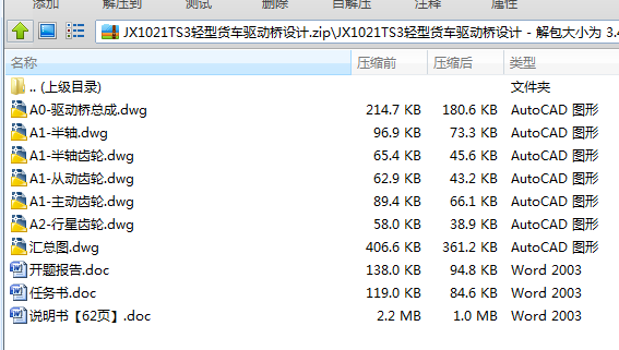 本设计首先论述了驱动桥的总体结构,在分析驱动桥各部分结构型式、发展过程及其以往形式的优缺点的基础上,确定了总体设计方案:采用整体式驱动桥,主减速器的减速型式采用单级减速器,主减速器齿轮采用螺旋锥齿轮,差速器采用圆锥行星齿轮差速器,半轴采用全浮式型式,桥壳采用铸造整体式桥壳。在本次设计中,主要完成了单级减速器、圆锥行星齿轮差速器、全浮式半轴的设计和桥壳的校核及材料选取等工作。最后运用AUTOCAD完成装配图和主要零件图的绘制。