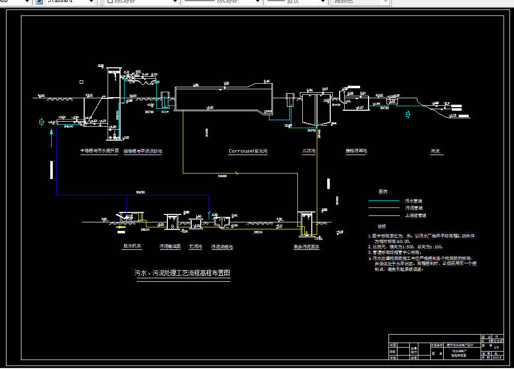 污水经过格栅泵房后进入沉砂池,然后经过氧化沟、二沉池、消毒池后排入河流。污泥经过浓缩池后到贮泥池再经脱水间脱水外运。
