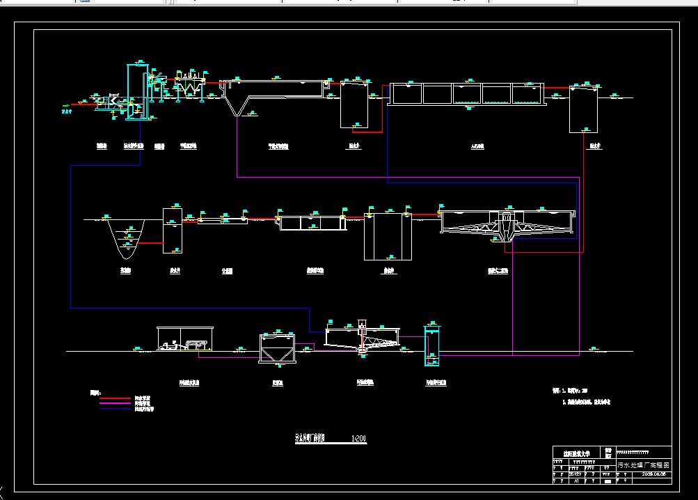 在完成污水和污泥处理构筑物的设计计算后,根据平面布置的原则,综合考虑各方面因素进行了污水厂的平面布置。据污水的流量对连接各构筑物的管渠进行了选径、确定流速以及水力坡降,然后进行了水力损失计算。据水力损失计算对污水和污泥高程进行了计算和布置。在最后阶段完成了对平面图、高程图及各种主要的构筑物的绘制。