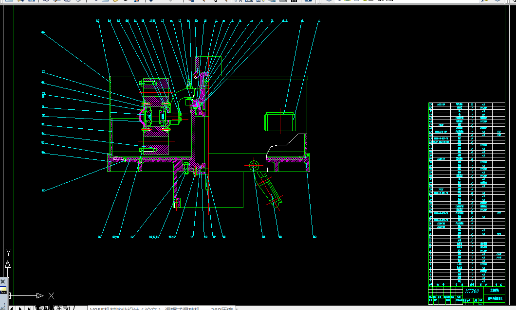 在这些部分中比较重要的是控制部分的设计,传动机构和砂门控制机构。控制部分设计采用了PLC控制。在传动设计中,首先对传动方案确立,然后在对传动部件的进行设计。在传动部件的设计中我主要设计其中的一级圆锥减速箱的中传动部件的设计,还有混砂机立式主轴的设计。在砂门控制部分,设计的要点在气缸的选择上。通过这些使新设计的混砂机在使用时更加平稳,适应性更强,效率高,而且具有结构紧凑,比例协调,美观大方,价格便宜的优点。