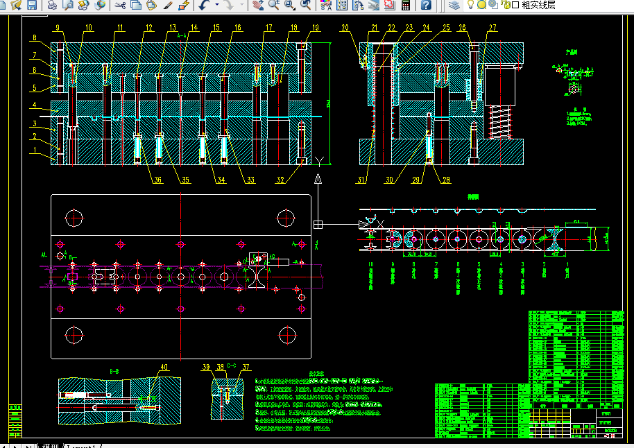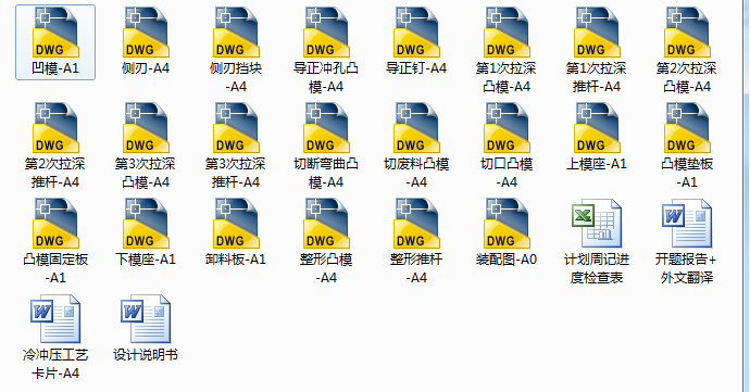 本模具采用切废料方式进行冲压,模具结构采用切口、拉深、冲导正孔、导正再拉深、切废料、弯曲、切断的工序设计,排样采用单排横排排列。并采用正装方式设计模具结构,即凹模装在下模部分,同时为了正确控制送料步距采用单侧侧刃定距,在主要位置采用导正销导正精确定位。由于料较薄,冲压速度较快,卸料可采用弹性卸料结构,建议弹性材料采用弹簧。废料采用在凹模(下模)向下推出,最后产品也是在下模向下推出。带料采用自动左右有侧压的送料装置。同时为了正确控制送料步距采用侧刃定距。由于料不是很厚,冲压速度适中,故卸料采用弹性卸料结构,弹性材料采用矩形截面弹簧。废料和产品均采用向下推出。带料采用自右向左的自动送料装置。