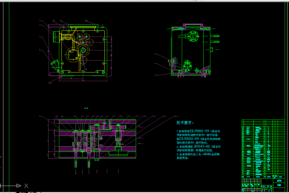 组合机床是以通用部件为基础,配以按工件特定形状和加工工艺设计的专用部件和夹具,组成的半自动或自动专用机床。组合机床一般采用多轴、多刀、多工序、多面或多工位同时加工的方式,生产效率比通用机床高几倍至几十倍。由于通用部件已经标准化和系列化,可根据需要灵活配置,能缩短设计和制造周期。多轴箱是组合机床的核心部件。它是选用通用零件,按专用要求进行设计的,在组合机床设计的过程中,是工作量较大的部件之一。它是根据工序图和加工示意图所确定的工件加工孔的数量和位置,切削用量和主轴类型设计的传递各主轴运动的动力部件。其动力来自通用的动力箱,与动力箱一起安装于进给滑台,可完成钻,绞等加工序。