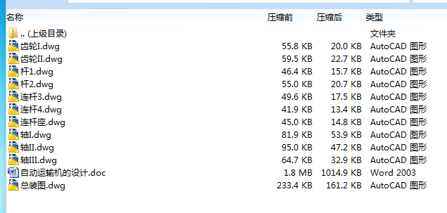 机械在日常工具的生产中发挥着日益重要的作用。随着科学在机械行业的发展突飞猛进,机器的性能越来越好发展,自动化程度也越来越高。人们所以要广泛使用机器是由于机器既能承担人力所不能或不便进行的工作,又能较人工生产改进产品的质量,能够较大提高劳动生产率和改善劳动条件。本次论文是要设计一种自动运输机,以提高在车间流水线上的生产效率。它的主要作用是能够完成对工件的间歇输送并自动复位,周而复始的往复工作。在设计时,首先要结合实际分析其工作原理,再根据其工作原理选择适当的设计方案,设计方案要具体到每一个环节选择什么样的部件以及每个部件的尺寸大小。当传动方案确定下来后,绘制出简图,并在具体的设计过程中不断修改总图,使之不断完善。