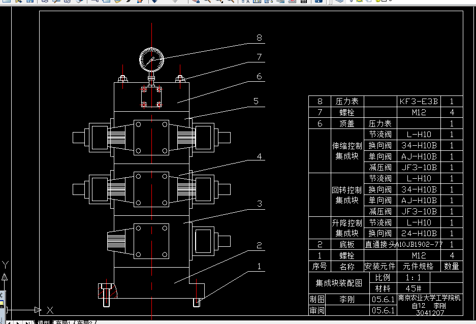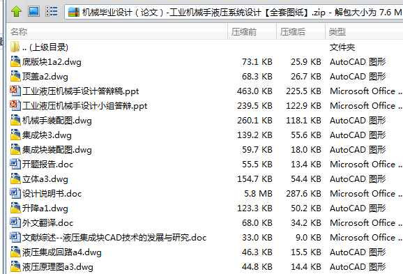 、摘要:本文主要介绍了上下料用机械手的设计过程,它包括了对于整个系统的工作要求和情况的分析,通过系统的工作过程确定整个液压系统的结构设计。分析整个循环过程,确定系统工作原理图,根据系统参数要求选择标准的液压元件,完成液压系统的装配图。液压集成块作为现在液压系统的主要部件,当前液压集成块应用开发受到了国内外液压界的广泛重视,液压集成块的CAD的研究与开发已为液压工程设计提供了有力的支持,在对机械手液压系统集成块设计过程中,能够与实际的加工工艺相结合。并且对现在的液压集成块的CAD技术有很好的认识。