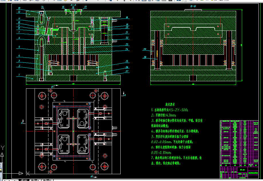 通过对塑件的结构分析,本次设计采用一模四腔设计,滑块侧抽芯机构,实现照相机外壳侧孔的生成;采用侧浇口形式;塑件的体积适中,采用推杆推出实现脱料。采用此模具结构不仅可以保证塑件的表面要求和尺寸精度,而且生产率高、成本低、结构简单,可行性强,是一副实用性很强的模具。