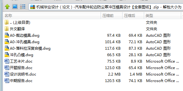 本设计是汽车配件轮边防尘罩冲压模具设计,分析工件结构,其主要包括落料;拉深;冲孔;修边。首先确定工艺方案,选择一个比较合理的设计方案。其次,根据设计方案确定一共需要多少副模具来完成轮边防尘罩的生产。在本次设计中,采用三副模具来生产该工件。第一副是落料拉深,第二副是冲孔,第三副是修边。每副模具的设计中都包括凸凹模刃口尺寸的确定和结构形式,定位零件的设计,卸料与推件装置的设计,以及其它辅助零件的设计。在模具的设计过程中首先要考虑零件工作的合理性,然后考虑零件的经济性。