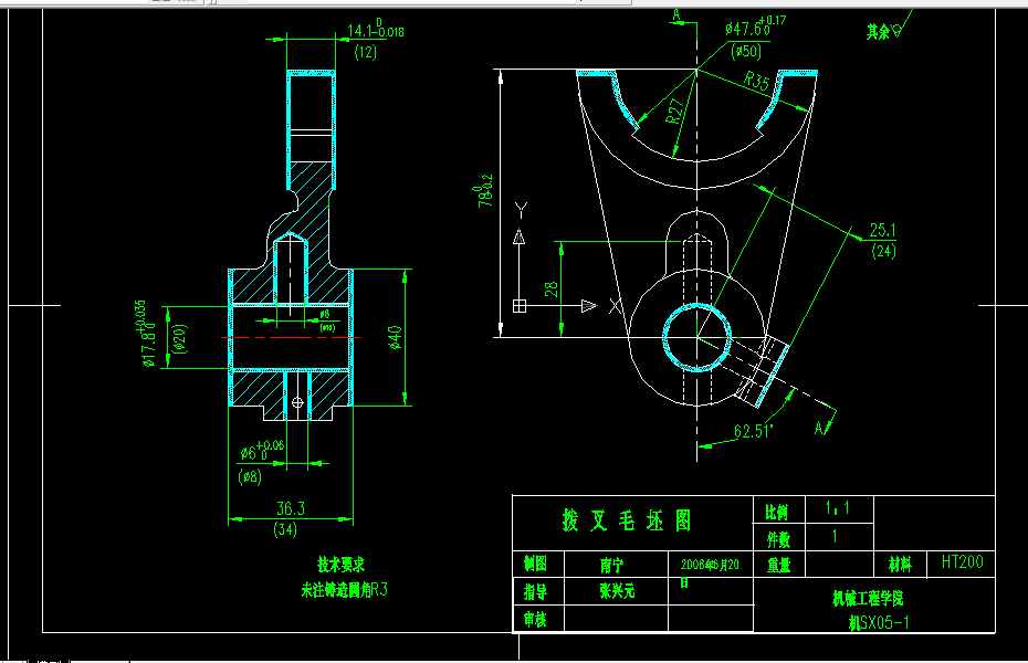 这次设计的是拖拉机用拨叉零件,包括零件图、毛坯图、装配图各一张,机械加工工艺过程卡片和与工序卡片各一张。首先我们要熟悉零件和了解其作用,它位于拖拉机变速箱的换挡机构中,主要起换档作用。然后,根据零件的性质和零件图上各端面的粗糙度确定毛坯的尺寸和械加工余量。最后拟定拨叉的工艺路线图,制定该工件的夹紧方案,画出夹具装配图。