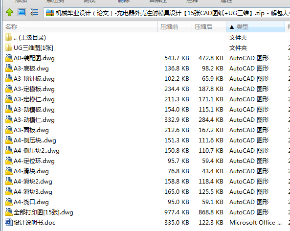 近几年国家振兴机械行业,与机械相关的各个行业都越来越重视CAD/CAM技术,不仅是因为CAD/CAM技术已发展成为一项比较成熟的共性技术,同时还因为塑料制品及模具的3D设计与成型过程中3D分析正在塑料模具工业中发挥越来越重要的作用。在本次毕业设计中,通过运用三维实体造型高端软件PROE对“充电器外壳”外形进行3D造型,同时也设计了其塑料外壳注塑模的3D模型;还根据所设计的模具尺寸选择安装了相应的模架,最终生成了直观的结构设计图;此外还利用CAD绘制了模具装配图以及各种成型零件图。这是第一次利用绘图软件对整套模具进行设计,对所学知识进行了全面巩固,意义重大!