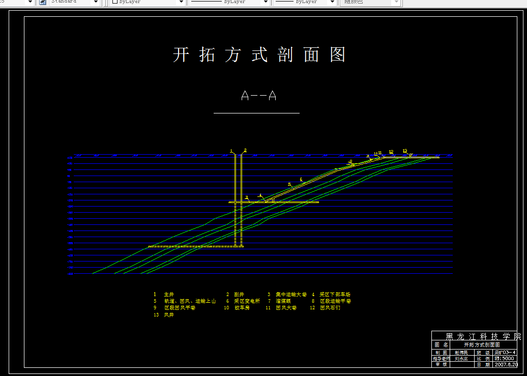 本设计矿井为七台河精煤集团公司新兴七矿0.9Mt/a新井设计,井田内一共有5层可采煤层,分别为60#、63#、65#、67#、68#层, 煤层总厚度为5米。煤层工业牌号为1/3焦煤,设计井田的可采储量63Mt,设计服务年限为50年,本矿井设计采用以立井为主的综合开拓方式,划分为二个水平,四个采区。每个采区为双翼开采,三个工作面达产,达产时采区个数为两个。采用分层布置,60#层单独开采,63#、65#、67#、68#层集中开采。大巷运输采用10t架线式电机车牵引5t底卸式矿车运输,采用的采煤方法为走向长壁采煤法,采煤工艺为普通机械化采煤工艺。顶板处理方法为全部跨落法。