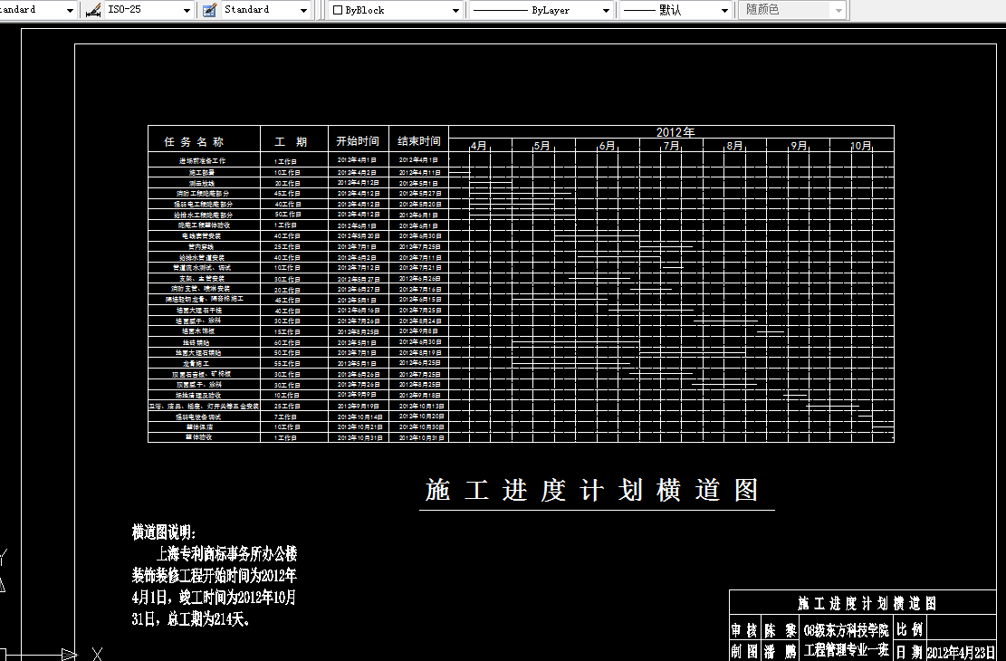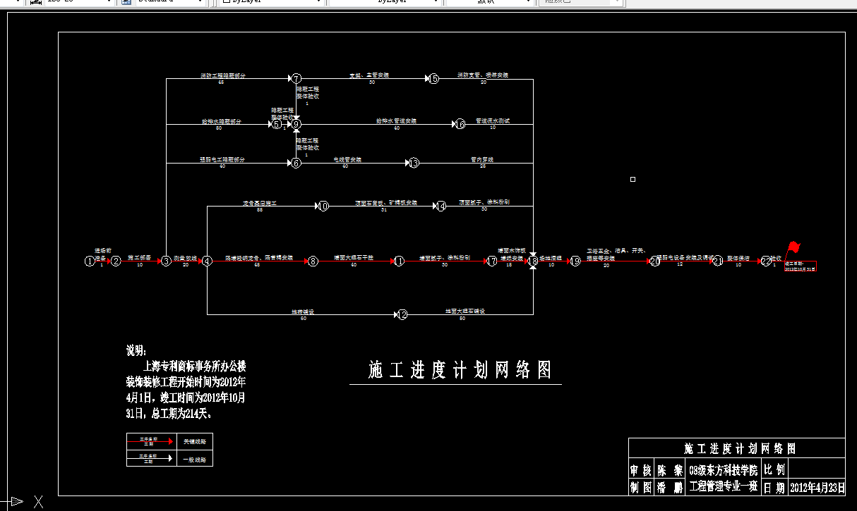 摘 要:施工组织设计是对施工活动实行科学管理的重要手段,它体现了实现基本建设计划和设计的要求,提供了各阶段的施工准备工作内容,协调施工过程中各施工单位、各施工工种、各项资源之间的相互关系。本设计是上海专利商标事务所办公楼装饰装修工程施工项目为实例,结合实际情况,对项目的各分部分项工程施工方案进行详细设计。从项目管理者的角度出发,对项目质量、进度、成本控制做了充分的优化考虑,使用横道图和网络图对进度计划进行分析,并根据实际情况提出具体的保证进度计划实施的措施。质量和成本方面,制定严格的技术、组织措施,以保证质量与成本得以很好实现。