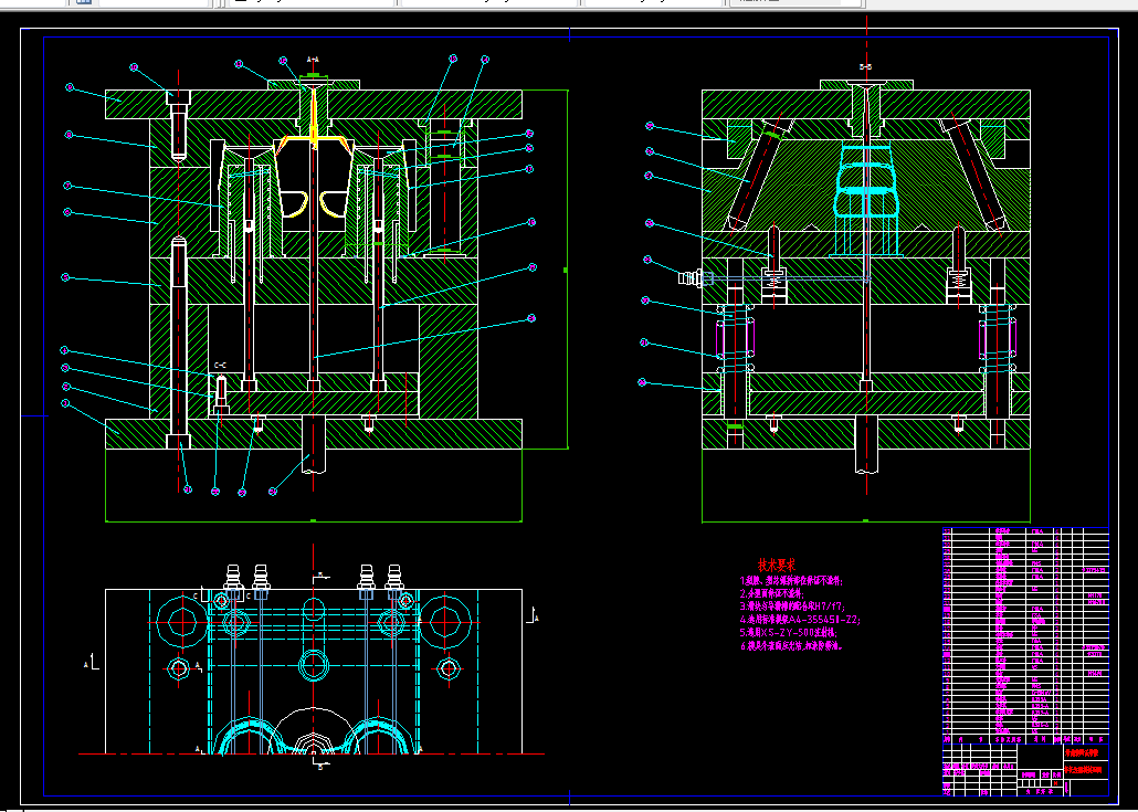 其次是模具的结构,在模具结构的设计当中,首先设计的是模具的型腔结构,接下来是型芯结构、斜导柱、滑块、导向机构、复位杆、拉料杆、推件杆和推出机构,这样做的目的是为了规范化,更重要的是为了以后与制造人员的配合。既让自己有了良好的设计习惯,又能锻炼自己的配合意识。为以后工作做一次演练,这样更能体现理论与实践相结合的目的。