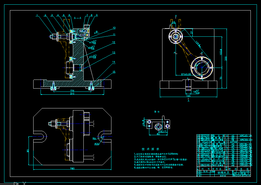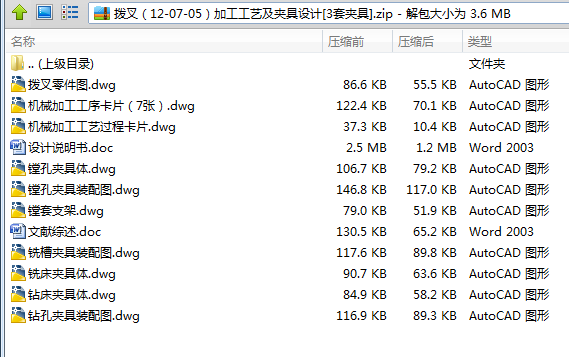 此次设计是对拨叉零件的加工工艺和夹具设计,其零件为锻件,具有体积小,零件复杂的特点,由于面比孔易加工,在制定工艺规程时,就先加工面,再以面为基准来加工其它,其中各工序夹具都采用专用夹具,特别的对于加工大头孔、槽和钻小头孔斜面小孔的工序中,选一面两销的定位方式,并以操作简单的手动夹紧方式夹紧,其机构设计简单,方便且能满足要求。