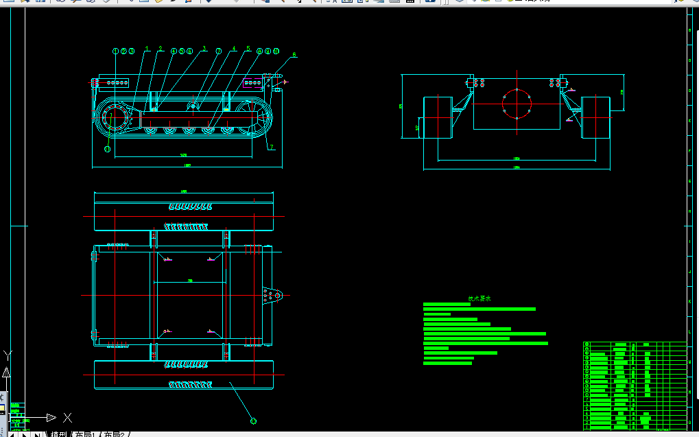 3. 履带式底盘的设计。设计驱动轮、支重轮、导向轮、拖链轮、履带张紧装置以及行走机构、履带架、底架等。