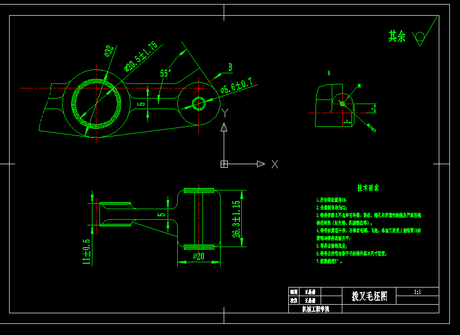 这次设计的是拨叉零件,包括零件图、毛坯图、夹具装配图、夹具零件图各一张,机械加工工艺过程卡片和与工序卡片各一张。首先我们要熟悉零件和了解其作用,该拨叉应用在某拖拉机变速箱的换挡机构中,主要起换档作用。然后,根据零件的性质和零件图上各端面的粗糙度确定毛坯的尺寸和械加工余量。最后拟定拨叉的工艺路线图,制定该工件的夹紧方案,画出夹具装配图。