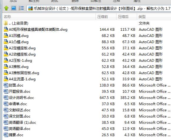 本设计主要是针对食品盒上盖的模具设计,通过对塑件进行工艺的分析和比较,最终设计出一副注射模。该设计从产品结构工艺性,具体模具结构出发,对模具的浇注系统、模具成型部分的结构、顶出系统、冷却系统、注塑机的选择及有关参数的校核都有详细的设计,同时简单的编制了模具的加工工艺。通过整个设计过程表明该模具能够达到此塑件所要求的加工工艺。根据题目设计的主要任务是食品盒上盖注射模具的设计,也就是设计一副注射模具来生产食品盒上盖塑件产品,以实现自动化提高产量,针对食品盒上盖的具体结构,该模具是侧浇口的单分型面注射模具。通过模具设计表明该模具能达到食品盒上盖的质量和加工工艺要求。