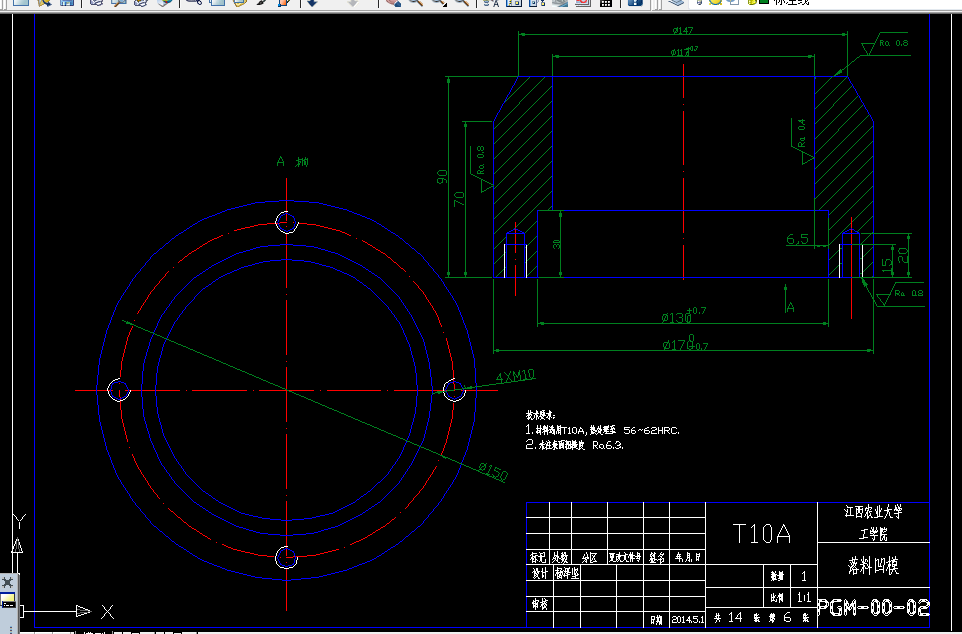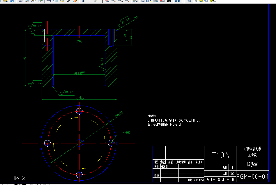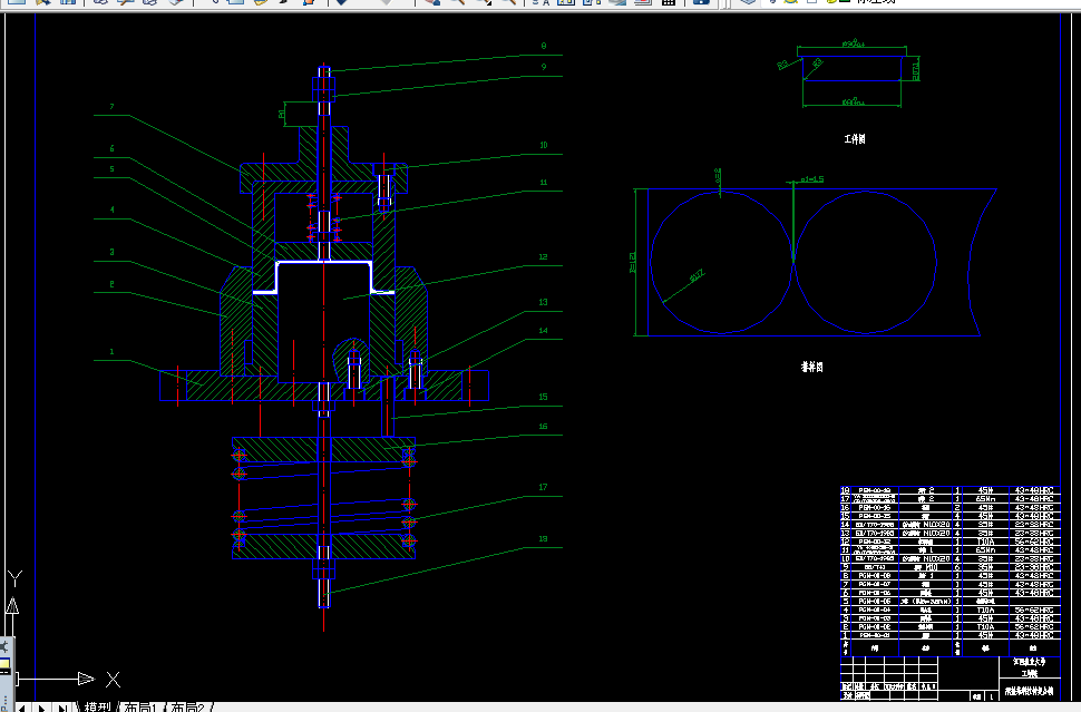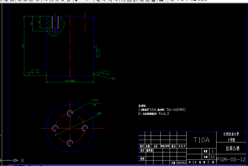本次课程设计的内容为用模具生产有凸缘筒形冲压件,其中主要包括落料、拉深两道工序。由于产品深度仅20mm,相对很浅,可以一次拉深成型,采用落料拉深复合模一次成型,效率高,并且成本较低。本次设计完成了产品的展开尺寸计算、排样计算、模具尺寸设计,最后使用计算机辅助设计工具AUTOCAD设计绘制模具的装配工程图和主要零件工程图。