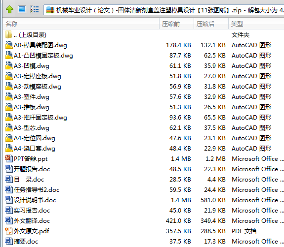 本次毕业设计的主要任务是对固体清新剂盒盖模具的设计,也就是设计一副注塑模具来生产固体清新剂盒盖的塑件产品,以实现自动化提高产量。该课题从产品结构工艺性,具体模具结构出发,对模具的浇注系统、模具成型部分的结构、顶出系统、冷却系统、注塑机的选择及有关参数的校核、都有详细的设计。本次设计综合运用了注塑成型工艺与注塑模具设计的相关知识,从材料、厚度均匀性、脱模角度合格成型面等方面分析该零件的塑料成型性能;根据零件体积和模具装配尺寸选择注射成型设备;在综合考虑生产批量、生产效率、精度要求等问题的基础上,制定了零件的成型工艺方案,绘制了模具装配图和部分零件图。