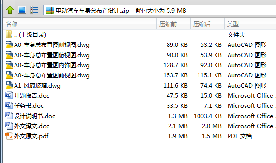 摘要: 电动汽车是高科技综合性产品,除电池、电动机外,车体本身也包含很多高新技术。车身的节能措施比提高电池储能能力还易于实现。采用轻质材料如镁、铝、优质钢材及复合材料,优化结构,可使汽车自身质量减轻30%-50%;实现制动、下坡和怠速时的能量回收;采用高弹滞材料制成的高气压子午线轮胎,可使汽车的滚动阻力减少50%。所以用新材料对纯电动汽车车身进行轻量化是不折不扣复合“低碳”经济。比如碳纤维代表着当今最先进的汽车车身材料。本次设计根据汽车车身设计方法的原则进行了汽车造型设计。然后进行车身总布置参数的确定及整车坐标零线的确定。还应在满足人机工程学所规定的最舒适姿势对整车车身轻量化设计。然后根据95百分位男性和5百分位女性进行H 点座椅设计,之后进行95百分位眼椭圆的确定还有头部包络线的校核,最后进行驾驶员视野校核。
