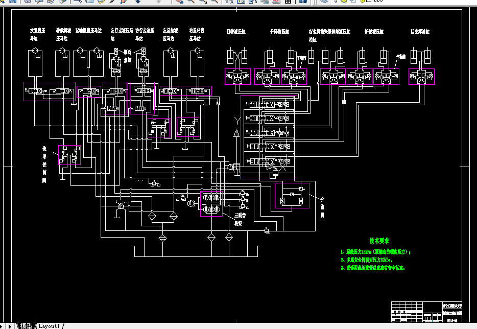 在液压系统设计部分,基本上确定各零部件的液压使用原理及参数计算。这里分析计算了截割部、行走机构、装运机构、中间运输机等载荷分析。马达部分的确定:装载部的星轮机构马达、行走机构的驱动马达、中间运输机的驱动马达等。油缸部分的确定:升降油缸、回转油缸、伸缩油缸、履带行走机构的张紧油缸、铲板部的升举油缸的计算设计。
