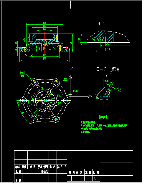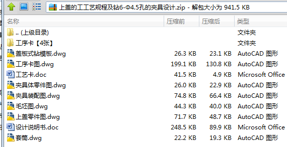 上盖加工工艺规程及其钻6-Φ4.5孔的夹具设计是包括零件加工的工艺设计、工序设计以及专用夹具的设计三部分。在工艺设计中要首先对零件进行分析,了解零件的工艺再设计出毛坯的结构,并选择好零件的加工基准,设计出零件的工艺路线;接着对零件各个工步的工序进行尺寸计算,关键是决定出各个工序的工艺装备及切削用量;然后进行专用夹具的设计,选择设计出夹具的各个组成部件,如定位元件、夹紧元件、引导元件、夹具体与机床的连接部件以及其它部件;计算出夹具定位时产生的定位误差,分析夹具结构的合理性与不足之处,并在以后设计中注意改进。
