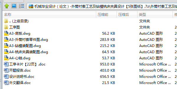 本文共有四大章,第一章对外筒衬套零件进行了详细的工艺分析;第二章详细介绍了零件工艺规程的编制,包括工艺路线和工序的设计;第三章对某些工序的专用夹具的设计方法及步骤进行了详细的说明;第四章对毕业设计的整体设计过程进行总结概括。