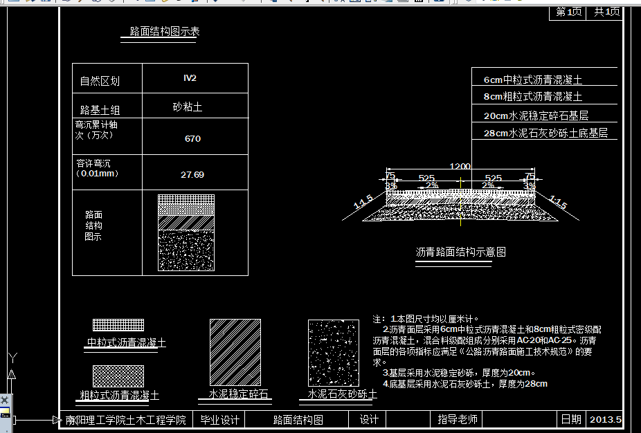 8、沥青路面结构设计:拟定路面结构组合方案;轴载换算,预估设计年限标准轴载累计作用次数,确定路面设计弯沉值;确定路基路面结构层设计参数;确定路面设计层厚度;验算各层层底拉应力。