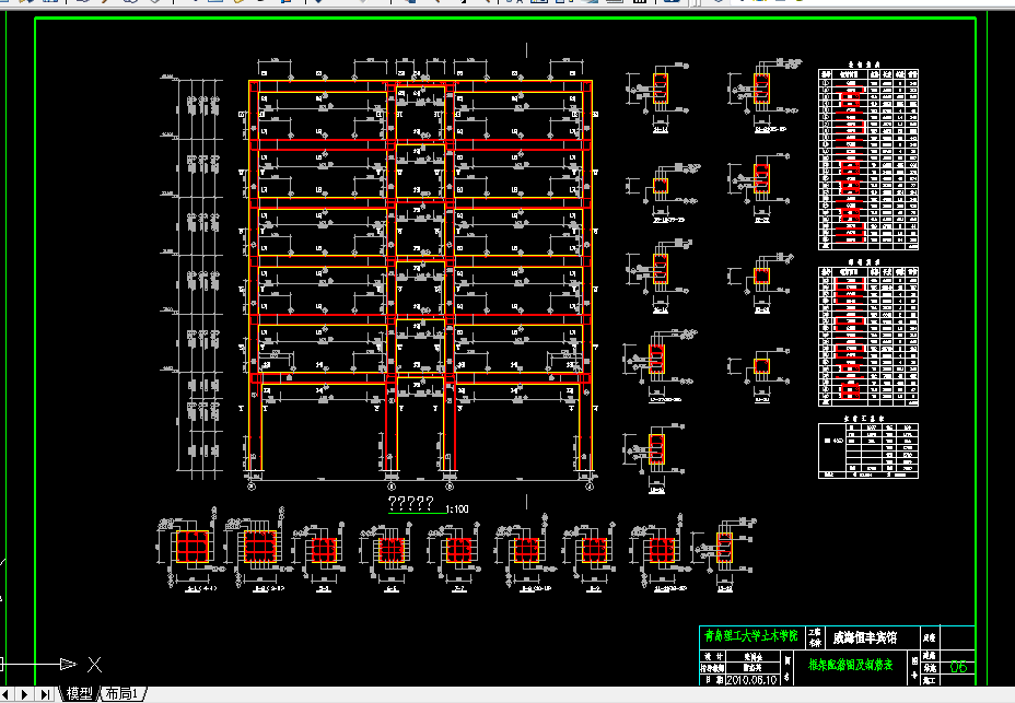 此外,还进行了结构方案中楼梯和基础的设计,并完成了平台板、梯段板和平台梁等构件的内力和配筋计算以及施工图的绘制。框架受力钢筋主要采用二级钢,箍筋主要采用一级钢,楼梯采用现浇钢筋混凝土板式楼梯,基础均采用现浇钢筋混凝土柱下独立基础。