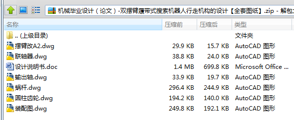 本研究所设计的搜救机器人移动方案是履带式驱动结构。搜救机器人的运动平台应尽可能适应多种复杂的井下地形条件,如废墟、泥地、沙地、台阶、陡坡、壕沟等,即具有较强的地形适应能力;除此之外,还要具有一定的运动速度和良好的运动学稳定性,尽可能减少倾覆或翻滚的可能。设计的机器人移动机构主要由四部分组成:主动轮减速驱动机构、摆臂减速转动机构、自适应路面执行机构、履带及履带轮运动机构。本论文对上述各部分方案分别进行论证、结构设计计算.