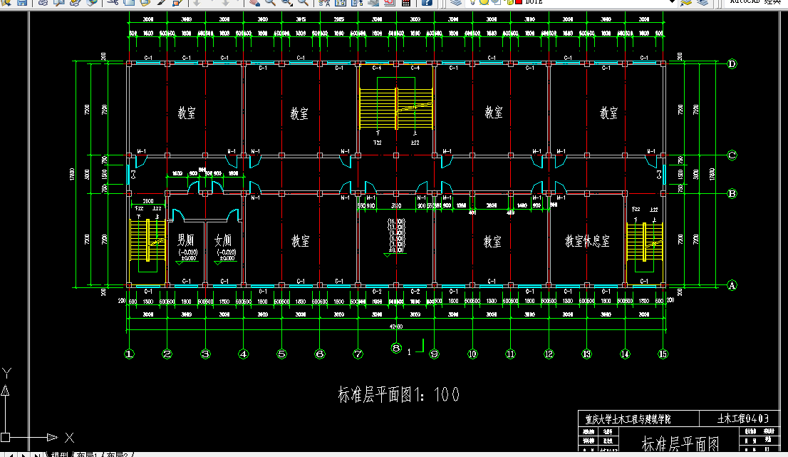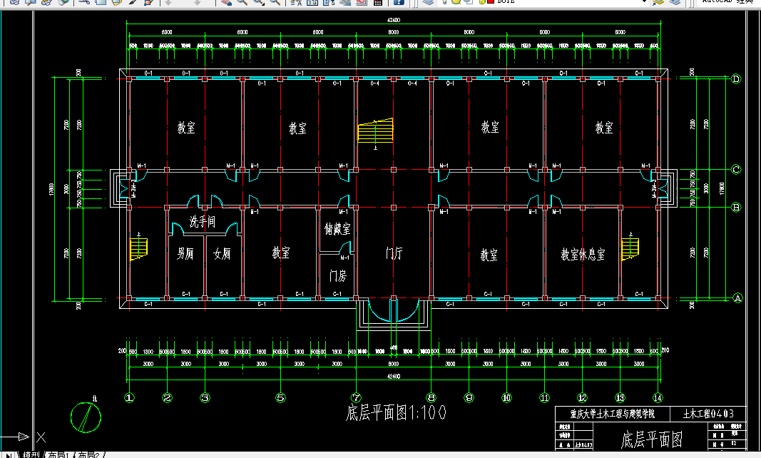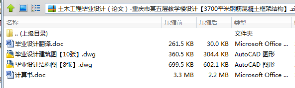 根据教学楼设计规范和其它相关标准,以及设计要求和提供的地质资料,设计该框架结构教学楼。 按照先建筑后结构,先整体布局后局部节点设计步骤设计。主要内容包括:设计资料、建筑设计总说明、建筑的平面、立面、剖面图设计说明,以及其它部分的设计说明;结构平面布置及计算简图确定、荷载计算、内力计算、内力组合、主梁截面设计和配筋计算、框架柱截面设计和配筋计算、次梁截面设计配筋计算、楼板和屋面设计、楼梯设计,基础设计等。其中附有风荷载作用下的框架弯矩、剪力和轴力图;纵向和横向地震荷载作用下的框架弯矩、剪力和轴力图;恒荷载和活荷载作用下的框架弯矩、剪力和轴力图以及梁柱的内力组合表。