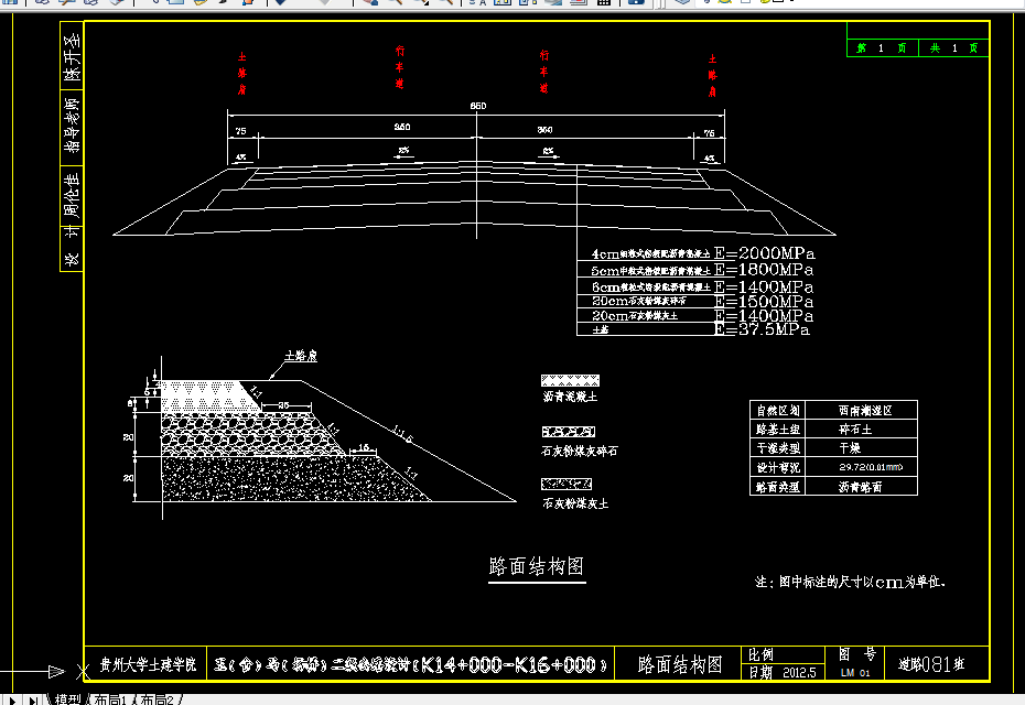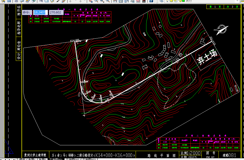 根据设计任务书的要求,本设计是贵州省六盘水市玉舍至马场桥的一段二级公路设计。根据当地政治、经济、文化、交通、地形、交通远景规划等因素综合考虑,拟建成双向两车道。设计速度为40km/h(山岭重丘区),全长2005.708千米,路面宽7m,路基宽度为8.5米,最小平曲线半径为60米,平曲线最小长度为160.298米。最大纵坡为6.13%,最小纵坡为1.92%,最小竖曲线半径为1500米,最小竖曲线长度为105.024米,最小坡长为169.056米。设计内容包括路线方案论证与比选、路线的平、纵、横设计、路基设计、挡土墙设计、路面设计等内容。在设计中参考了大学四年所学的大部分专业课程教材、部分基础课程教材,以及中华人民共和国交通部颁布的行业规范和部分国内外先进理论及经验。