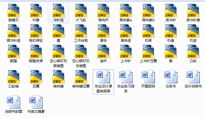 本课题来源于盐城市农机所。本设计主要用于铆合 空心铆钉,总体设计包括传动方案的制定,电机的选择,带轮的设计,主轴的设计等,并绘制空心铆钉机的总装图以及部装图,然后进行相关的设计计算和校核等。它的意义在于解决一些相对比较软的材料之间的连接,如:服装、皮鞋、布鞋、胶鞋、帐篷、帆布口袋等。从而实现从手工到机动铆接,提高劳动生产率,降低劳动强度,而且便于维修。