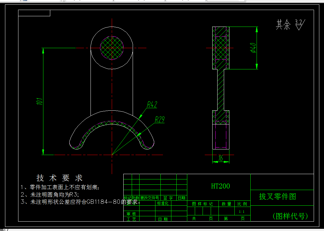 本设计是基于车床拨叉零件的加工工艺规程及一些工序的专用夹具设计。零件的主要加工表面是平面和孔系。一般来说,保证平面的加工精度要比保证加工精度容易。因此,本设计遵循先面后孔的原则。并将孔与平面的加工明确划分成粗加工和精加工阶段,以保证加工精度。主要加工工序是第一个支持孔定位加工出顶平面,然后顶平面和孔的位置的孔加工工艺配套系列。在后续工序中除与顶平面定位技术和加工其他孔与平面的个体的过程。利用坐标镗削加工孔。一般整个工艺的选择。专用夹具的夹具,夹紧方式多选用气动夹紧,夹紧可靠,机构不能自锁,因此生产效率高,适合于大批量、流水线上加工,能够满足设计要求。