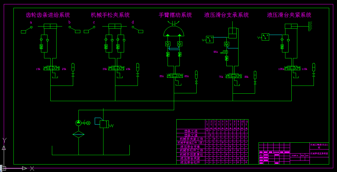 最后,将送料机构]液压滑台、控制部分及同组同学所设计的机械手机构、机床总体布局、液压部分总体规划,从而形成一个完整的机电一体化的上下料机构,以完成自动加工主动柱齿轮的第一道工序。