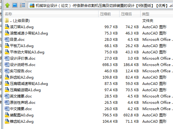 整个机构中,压扁输送辊和滚筒切碎装置本次设计的重点,两部分均采用立式安装,使整体机构变的紧凑,节省了空间,与前面的往复式切割系统能够很好的配合。此柠条联合收割机的设计为柠条的联合收割提出了新的方式,为后续的设计和研究提供了一个较好的方向。