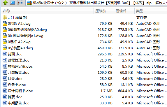 本文是关于工业用塑料聚合物双螺杆挤出机的设计。在工业上和实验室中,单螺杆和双螺杆挤出机都应用极其普遍,是塑料加工设备的重要元部件之一。作为工业中使用的双螺杆挤出机,在设计过程中,除了要求能够完成固体输送、增压、熔融、熔体输送和泵压等一系列通用过程以外,还要求涉及到复合塑料与聚合物颗粒之间的混合,以及物料喂料量的控制。物料喂料量的控制则是通过控制主螺杆及其辅助喂料螺杆的转速来完成的。同时,双螺杆挤出机具有分布混合和分散混合效果良好、自洁作用较强、可实现高速运转、产量高等特点,特别适合聚合物的改性,如共混、填料、增强及反应挤出。有利于增加挤出机的挤出产量,提高塑化质量。