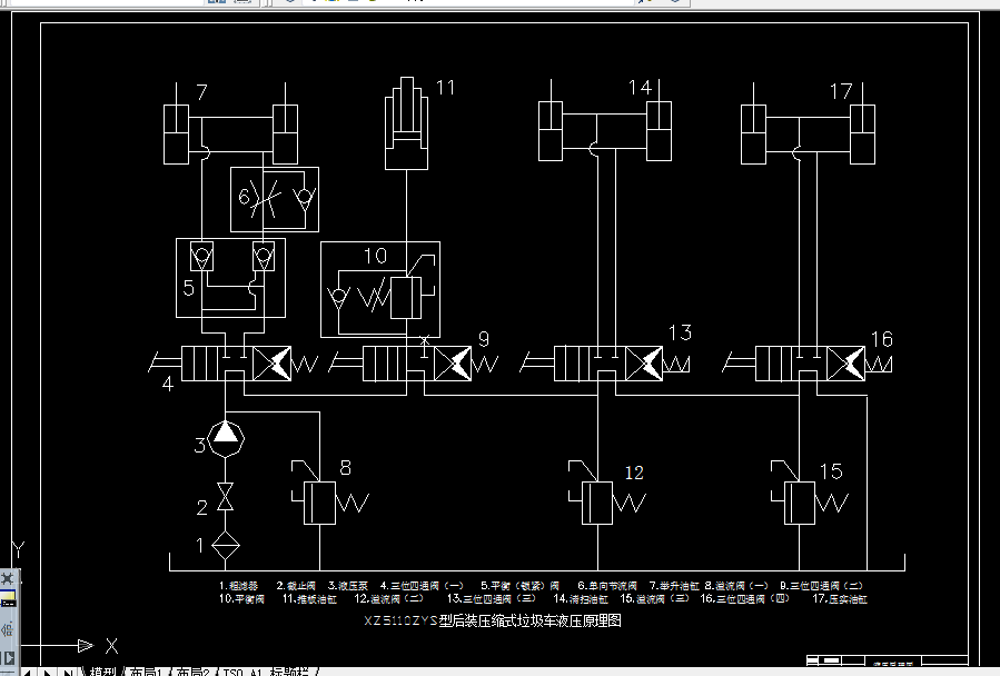 XZ5110ZYS型压缩式垃圾车专用装置的工作由专门设计的一套液压系统提供动力,从而实现对垃圾的清扫、压实和推卸以及举升后装压缩机构等基本功能。