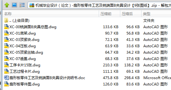本毕业设计为扇形板零件的加工工艺设计。本设计涉及到一张CAD零件图和三套夹具图的绘制,有车床夹具、钻床夹具、铣床夹具。对零件特性的综合分析,和一套完整的加工工艺方案和加工工序卡。本设计还从工厂的实际加工出发,从工厂的不同加工数量进行分析制作出加工工艺方案。这是对大学所学课程的一次综合使用,能把我们的知识结构进行一次梳理和复习,对我们的以后工作有着很大的帮助。