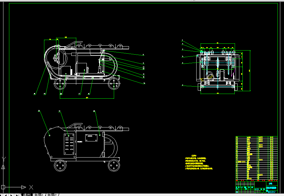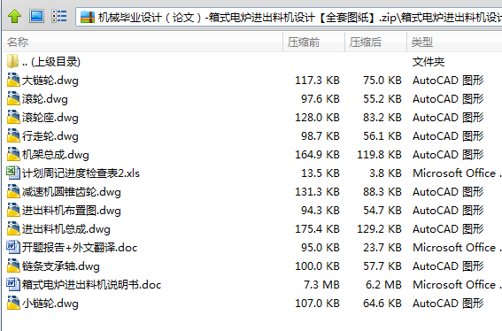 75kW和95kW箱式电炉是热处理专业厂及一般中型机械厂目前最常使用的热处理加热设备。过去传统的装出炉方法都是操作,采用手工将工件送入炉膛热处理后再由炉内取出。由于箱式电炉炉膛深,且工件只能在水平方向进出炉门,小工件随手甩进,大工件抬至路口用撬棒等推入炉门,劳动强度很大。为此,我们在毕业设计前提出了有关该课题的设计,该机使用于批量生产的机械零件热处理加热时的进出料,特别适用于RJX-75-9和RJX-95-9型等炉膛较深的箱式电炉加热大件时的进出料,也可用于炉膛尺寸与上述箱式电炉相近的燃料炉。经系列化后也可用于其他型号的箱式炉。箱式电炉进出料机的整机外形为一密封型小车,由电器控制系统、行走动力系统、推拉传动系统、推拉机构、机架、电磁止退系统等部分组成,此外还配有配套件地面导轨、炉内导轨及燃料等。其中电器控制部件全部装在小车体内,仅有控制按钮盒在体外作远距离控制之用。