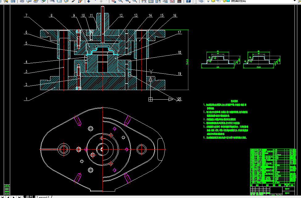 该零件是电喇叭底座,该产品的模具成本低、生产效率高。根据要求分析零件的工艺性,确定冲裁工艺方案及模具结构方案,然后通过工艺设计计算,确定排样和裁板,计算冲压力和压力中心,初选压力机,计算凸、凹模刃口尺寸和公差,最后设计选用零、部件,对压力机进行校核,绘制模具总装草图,以及对模具主要零件的加工工艺规程进行编制。其中在结构设计中,主要对凸模、凹模、凸凹模、定位零件、卸料与出件装置、模架、冲压设备、紧固件等进行了设计。
